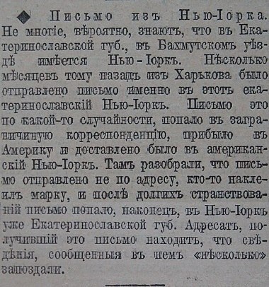 [club1543502|Письмо из Нью-Йорка]. Не многие, вероятно, знают, что в Екатеринославской губ., в Бахмутском уезде имеется Нью-Йорк.<br>Несколько месяцев тому назад из Харькова было отправлено письмо именно в этот екатеринославский Нью-Йорк. Письмо это по ка2 фото