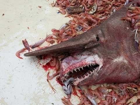 Рыбаки случайно выловили 5 метрового «гоблина». Промысловые рыбаки в Мексиканском заливе случайно поймали в свои сети доисторическую акулу-гоблина, которая является самой редкой из всех акул, когда-либо виденных человеком.. Длина пойманной неподалеку от3 фото