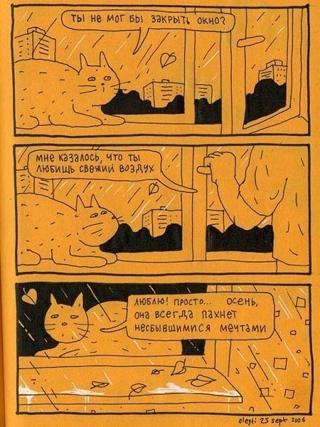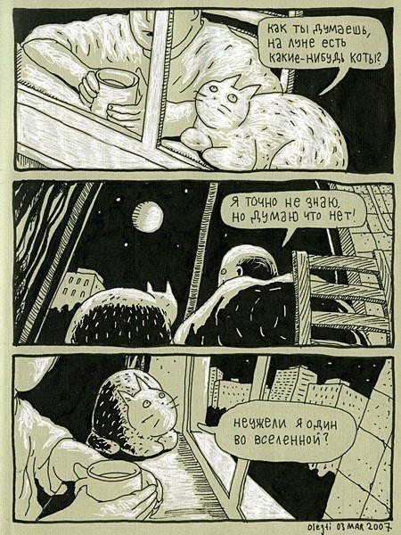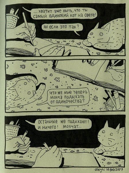 Автор философских комиксов «Человек и Кот» — Олег Тищенков — один из лучших российских и мировых иллюстраторов. В его рисованных историях художник и его домашний любимец ведут беседы, которые вызывают улыбку и заставляют задуматься. Парочка рассуждает про10 фото