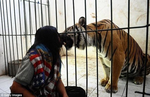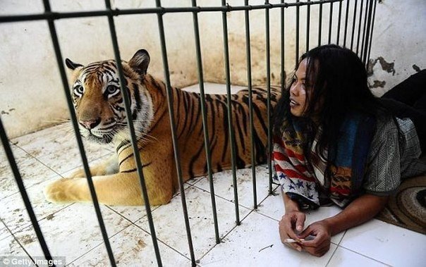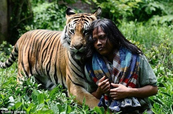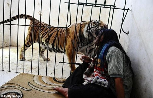 Дружба между тигрицей и человеком . Трогательные и в то же время опасные взаимоотношения тигрицы Мулан и его 33-летнего хозяина Абдуллы Шолен из Индонезии. . Абдулла- студент, который стал одновременно и лучшим другом, и нянькой для шестилетней тигрицы Му9 фото