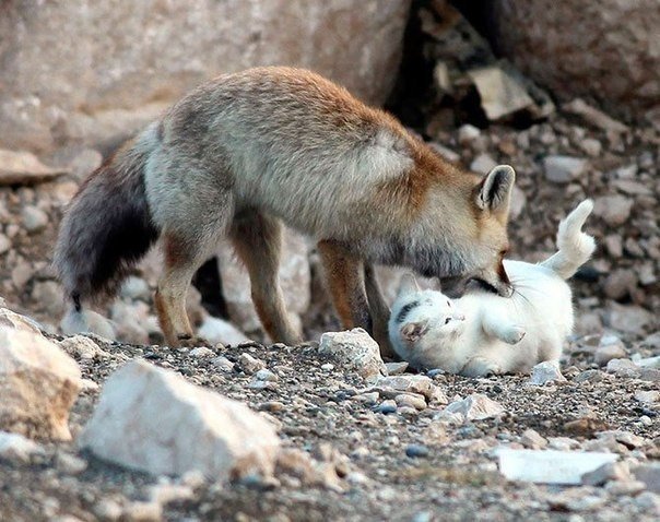Кот и лис – лучшие друзья. На берегу озера Ван, близ одноименного города, можно увидеть эту необычную парочку друзей – кота и лиса. Местные рыбаки говорят, что впервые они увидели этих приятелей, когда те ели оставленные от улова остатки рыбы. С тех пор с8 фото