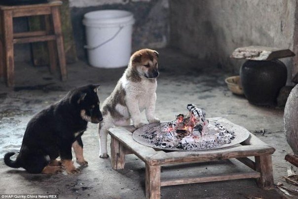 Умиляющие фотографии греющихся щенков возле жаровни5 фото