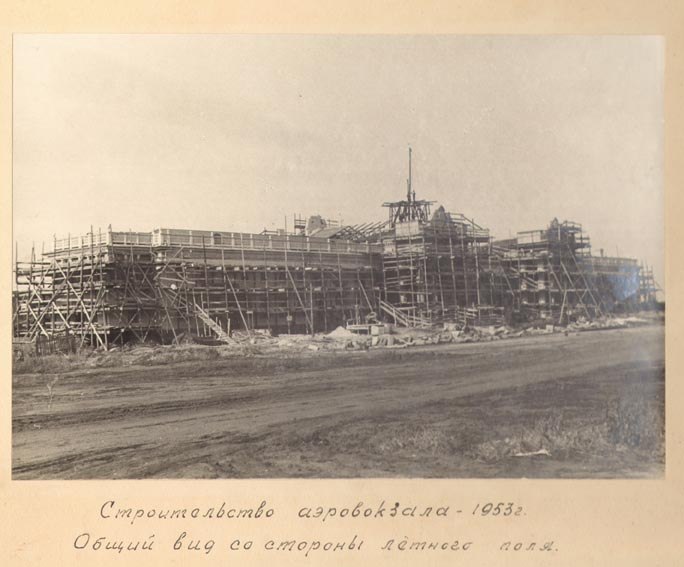 Аэровокзал, существующий до наших дней, был построен после окончания войны по типовому проекту московского НИИ «Аэропроект». Его строительство было начато в 1951 году, а торжественное открытие приурочено к празднованию 300-летия воссоединения Украины с Россией в 1954 году. Впоследствии, в 1954 году, из центра Харькова до аэропорта было открыто троллейбусное сообщение. Здание аэровокзала построено в стиле сталинской архитектуры, с большим количеством украшений: портик из восьми колонн и высокий парапет украшают центральных вход, золоченый венок возвышается над шатром башенки… В интерьере много лепных деталей и росписей. На первом этаже располагались зал ожидания и буфет, на втором – комнаты матери и ребенка и гостиничные номера.