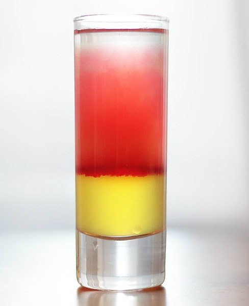 1) Налейте в стопку 20 мл сиропа маракуйи, сверху отдельным слоем - 15 мл сока лайма, а напоследок - 25 мл белого рома.