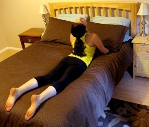 Сядьте поперек кровати с вытянутыми вперед ногами. Медленно опуститесь назад, так чтобы плечи и голова свисали с кровати. Постарайтесь достать руками до пола, испытывая при этом максимальное растяжение мышц груди, живота, рук. Зависните в таком положении на 30 секунд.