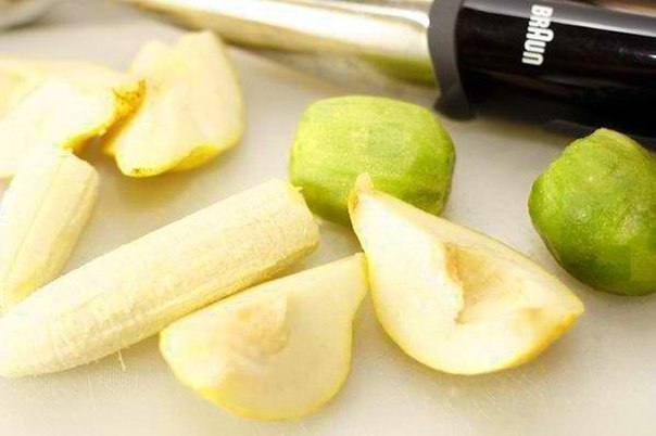 Шоколад - 10 грамм. Как готовить:. 1. Для коктейля нам понадобятся спелый банан, киви и сочная груша.. 2. Фрукты очистите и крупно порежьте.. 3. Из фруктов сделайте однородное пюре с помощью блендера.. 4. В пюре добавьте сахарную пудру и сок, чтобы получилась более жидкая консистенция. Если не добавлять сок, будет вкусное фруктовое пюре, которое можно есть ложкой.. При подаче можно посыпать коктейль тертым шоколадом или корицей.. Приятного аппетита!