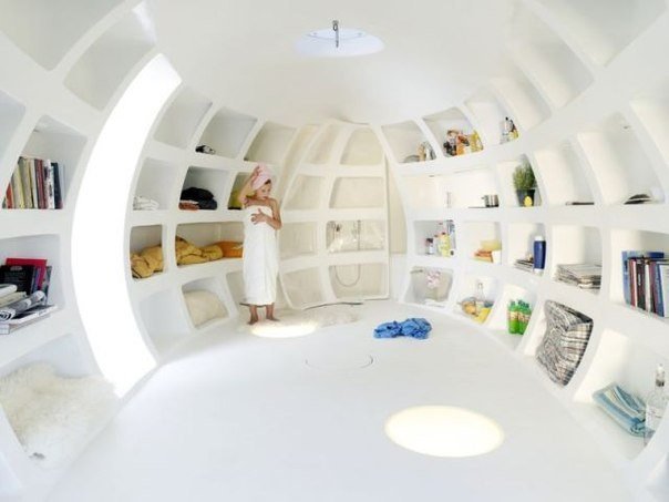 Внутри есть все необходимое для комфортной жизни - душ, кухня, кровать, большое количество стеллажей.