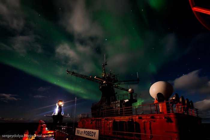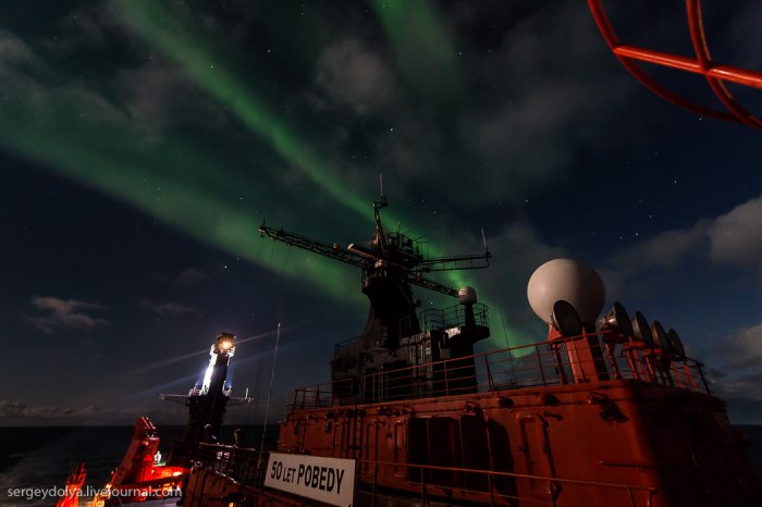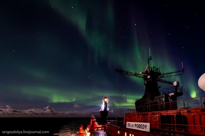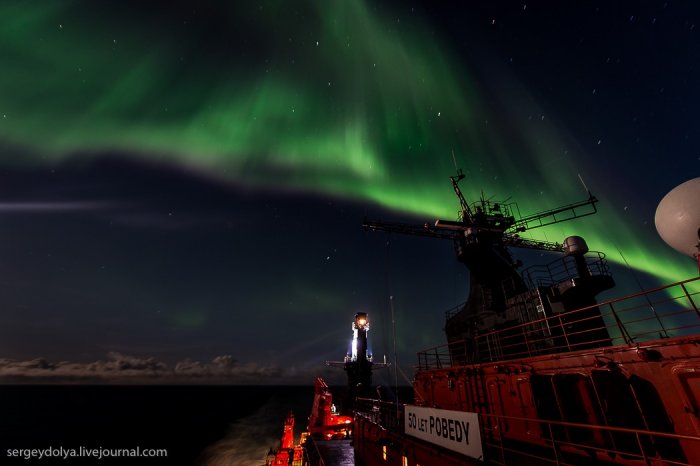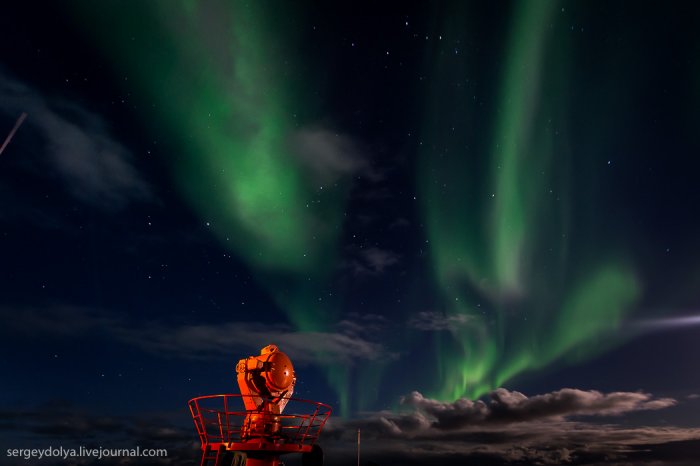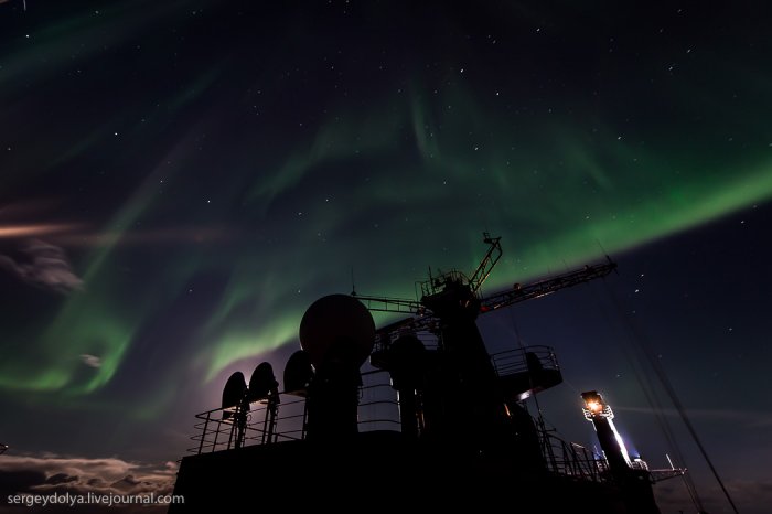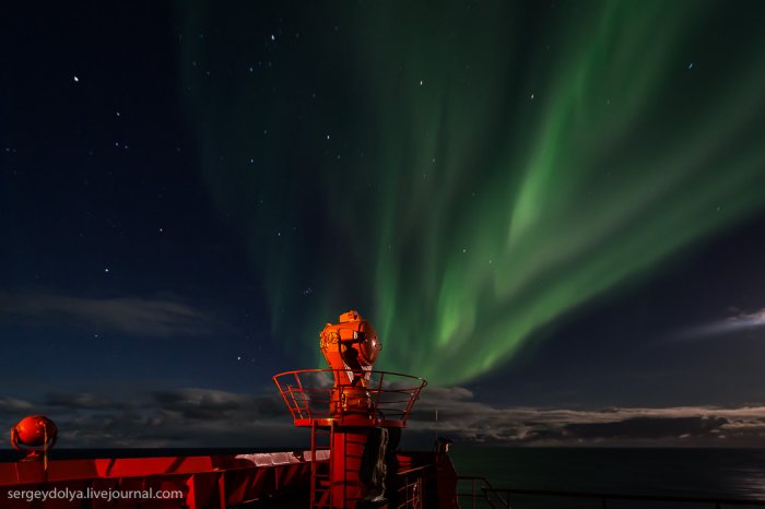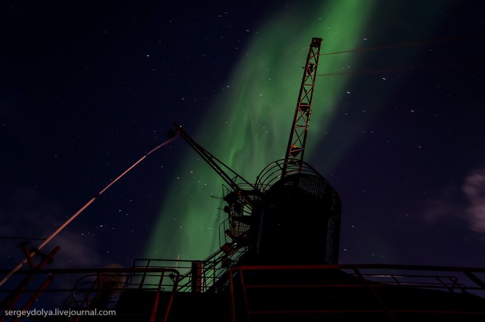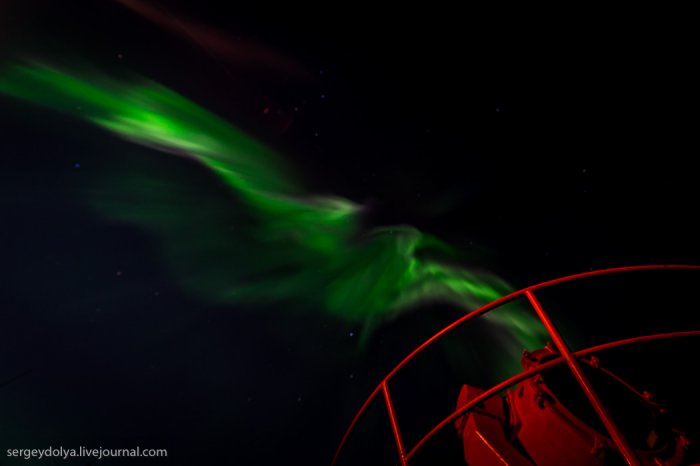 А за рахунок магнітного поля планети, яке притягує їх до полюсів, сяйво відбувається в полярних регіонах.Увідев на другу ніч експедиції північне сяйво, я спустився в каюти і повідомив про це всім колегам. Але, чи то мене не зрозуміли, чи то всім було ліньки, ніхто крім мене не вийшов знімати цю красу. А даремно - більше це рідкісне явище в нашій подорожі не повторювалося ...