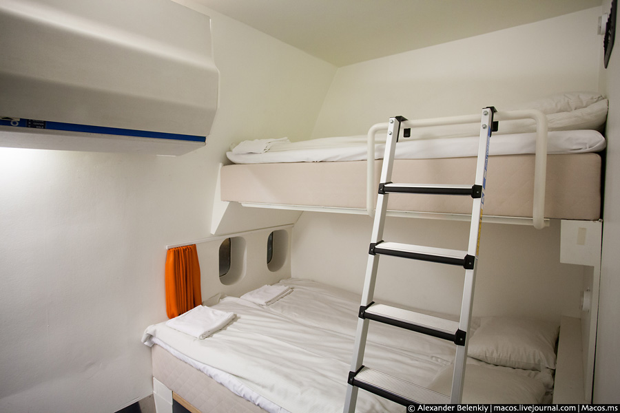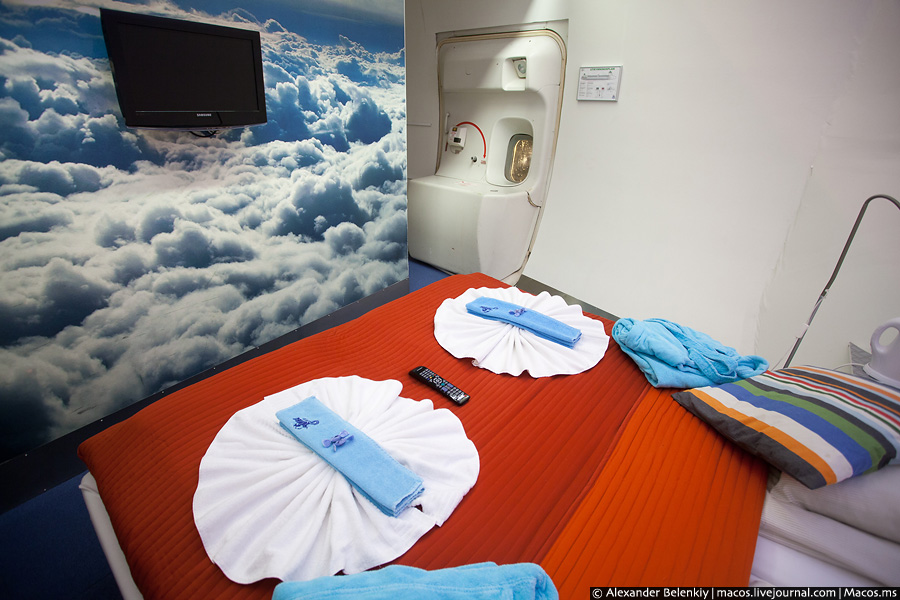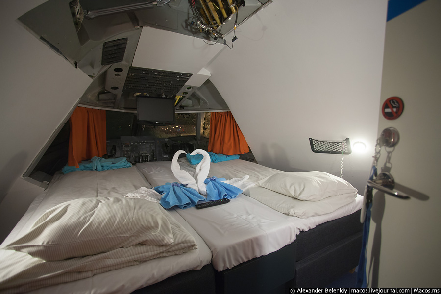 Переночувати в двоповерховому далекомагістральних Боїнги-747 можна від двох тисяч рублів за койко-місце. Кожен шматочок літака переобладнаний під готельні потреби: замість салону економічного класу тепер тут коридор з кімнат, а кабіна пілотів стала номером люкс.