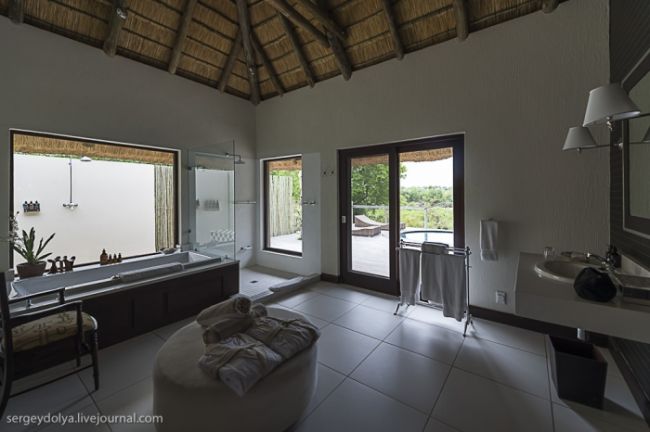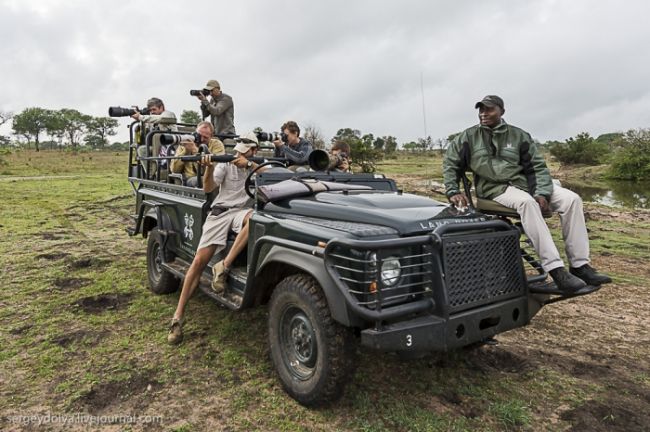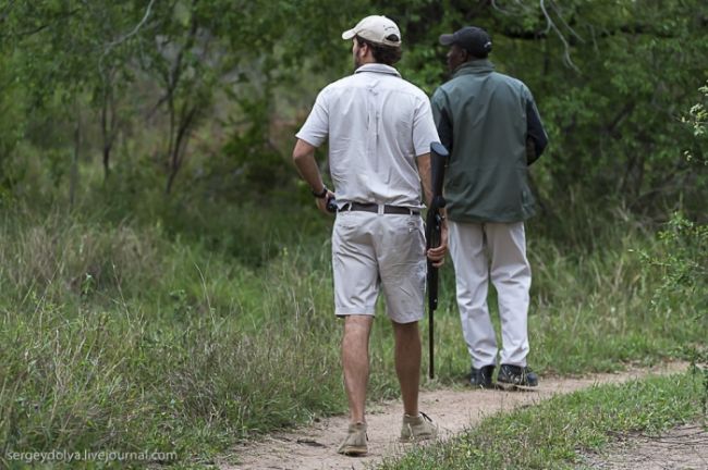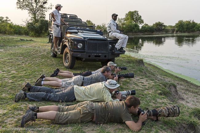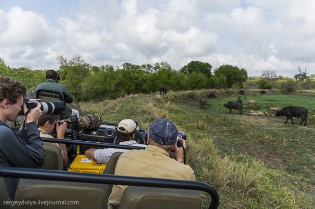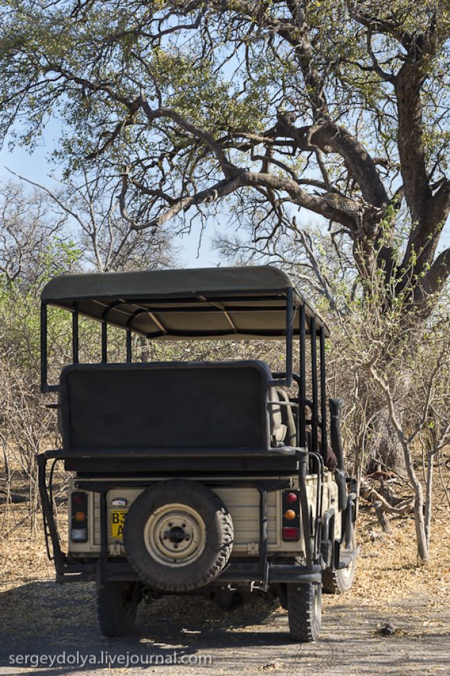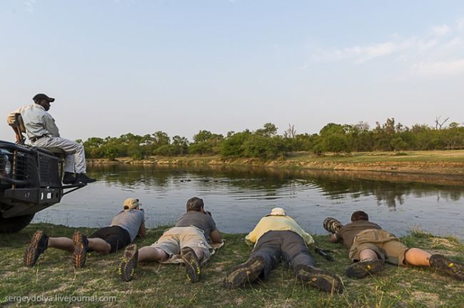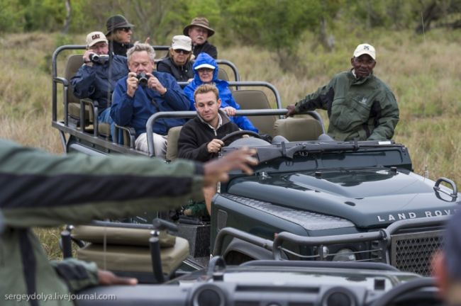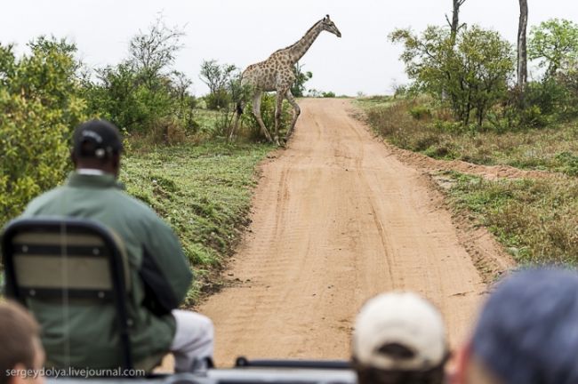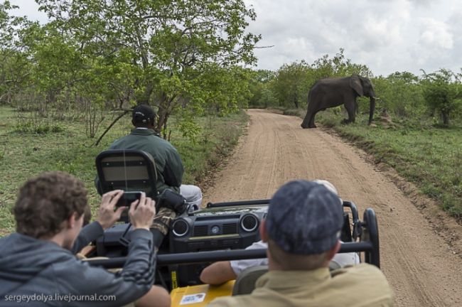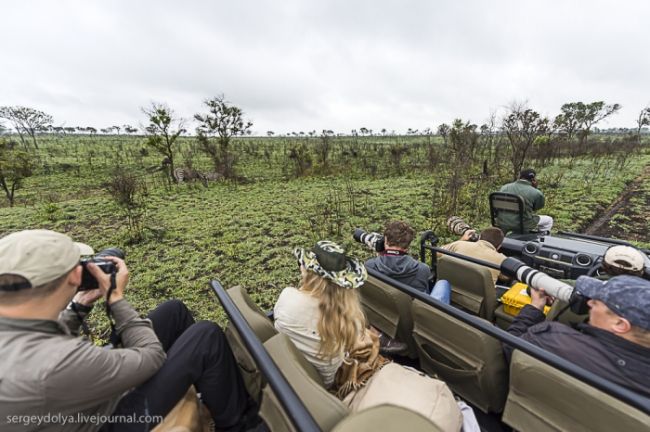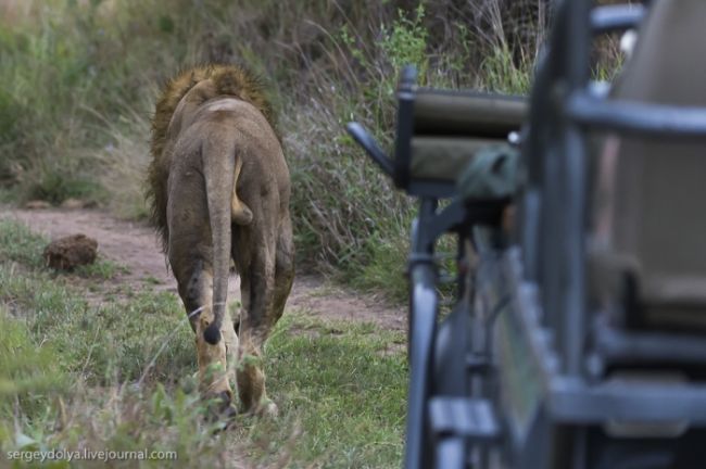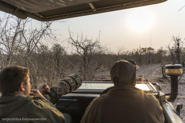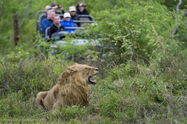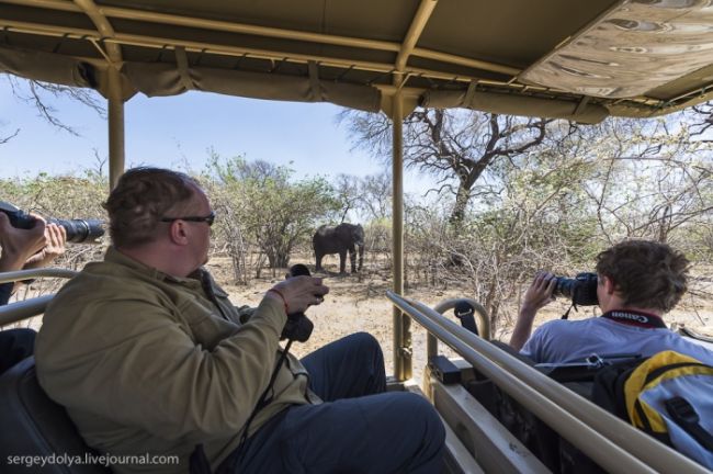 Як станься сафарі: тебе садять у відкритий автомобіль без вікон і даху і возять по дикій лісовій природі або по території національного парку. Коли по дорозі трапляються звірі, гід глушить машину і дає можливість розглянути тварин в природному місці існування. Виглядає це досить небезпечно, особливо коли під'їжджаєш до слону, який починає сурмити і мчати в твою сторону. Або сидіти поруч з левом, коли той в 2-3 метрах, а поблизу жодного дресирувальника. Вважається, що хижаки не сприймають автомобіль як гіпотетичну видобуток, і якщо сидіти тихо, не висувався з машини, то все буде добре. Організатори сафарі, звичайно ж, гарантують повну безпеку, але судячи з того, як ми плавали на краю водоспаду Вікторія або літали на вертольоті по каньйону, поняття безпеки у африканців дуже і дуже відносне & hellip;