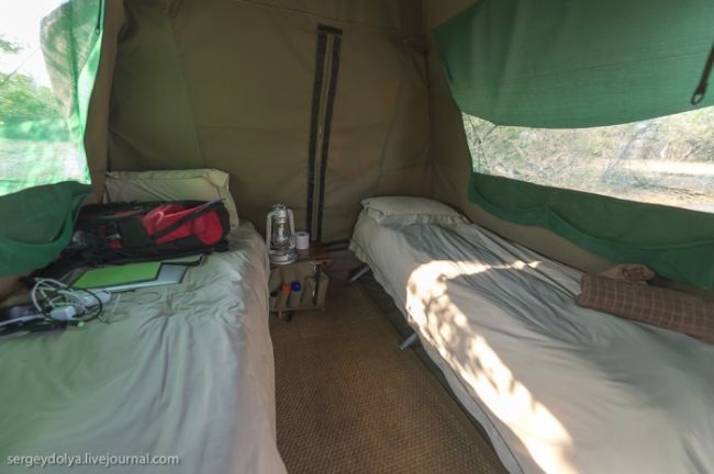 Скромна пристрій наших наметів включало в себе два ліжка з білизною. Через блискавку в задній стіні можна було пройти в & quot; прибудову & quot ;, де розташовувалися зручності: