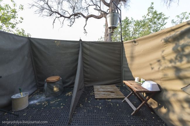 Справа душ - відро з водою, - зліва туалет - бочка з золою. Ми провели дві ночі в цьому таборі, майже ніхто не спав, все прислухалися до нічних шелесту. Аріна просиділа дві ночі з манікюрними ножицями в руках на випадок сутички з леопардами. Причому, варто зауважити, ночували ми в повній темряві, щоб не привертати звірів. Вранці поруч з наметами знаходили сліди гієн, бегемотів і леопардів. На другий день ми подякували наших гідів, сказавши, що вражень отримали досить, і замовили літак ...