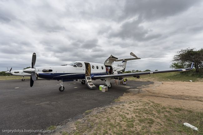 В останні три дні нашої подорожі ми возз'єдналися з відважними хлопцями, які залишилися в Ботсвані, і побували на ще одному сафарі в Крюгер-парку - заповіднику на кордоні з Мозамбіком. Туди ми прилетіли літаком, і, до речі кажучи, весь рух по Африці здійснюється в основному по повітрю. Мала авіація сильно розвинена в країні. Літак був невеликий, на шість посадочних місць: