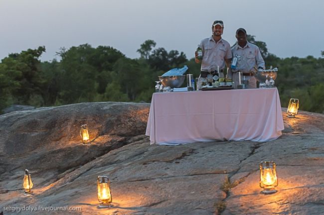 В один з вечорів нам підготували & quot; рояль в кущах & quot; - раптовий куточок цивілізації і африканського гостинності. Обов'язковий компонент такого столу - джин з тоніком, який, за легендою, вважається протиотрутою від малярії: