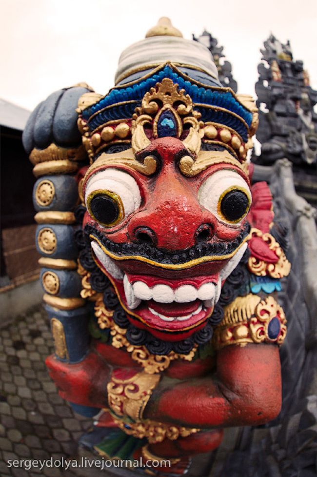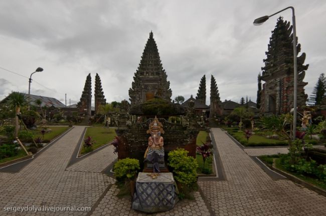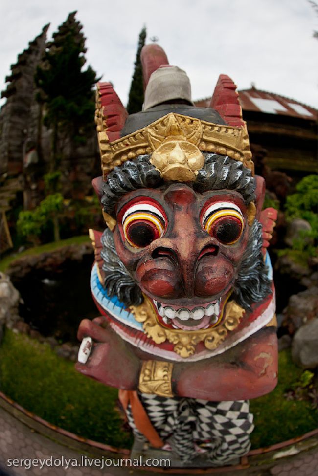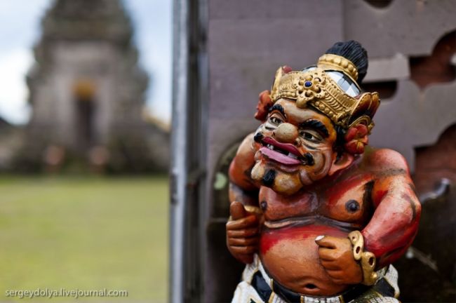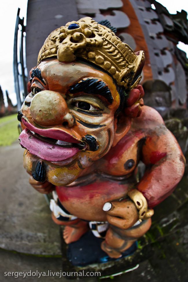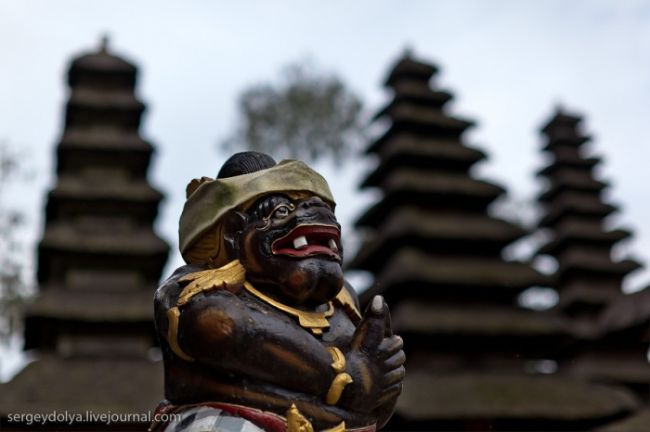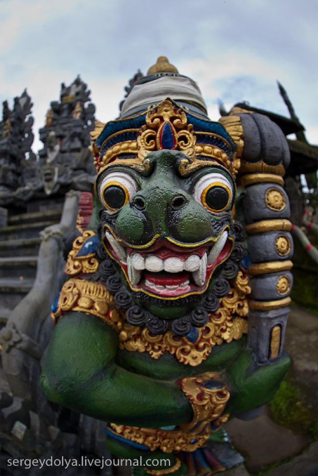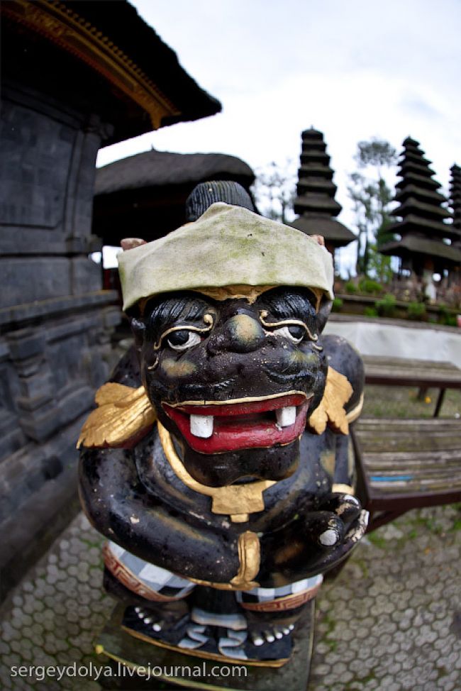 Він побудований на гребені кальдери вулкана Гунунг-Батура в 1926 році і присвячений богині річок і озер Деві батареї Улун Дану. У храмі дуже багато скульптур стражників, яких я фотографував своїм новим Фіша. Грізні воїни виходили досить комічно ...