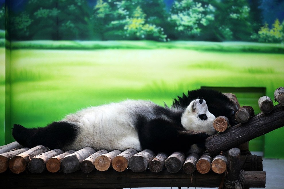 Китайський фотограф Лі Цзюньфен під час візиту до Національного парку водно-болотних угідь озера Тайху в місті Сучжоу, провінція Цзянсу, Китай, зафіксував дуже милое зображення: 10-річна панда на ім’я Синь Юэ абсолютно по-людськи відпочивала на дерев’яній конструкції.